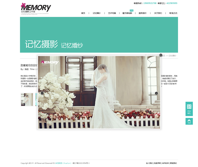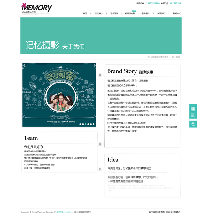 記憶視覺(jué)攝影有限公司(簡(jiǎn)稱:記憶攝影)記憶攝影正式成立于2008年,集頂尖攝影、造型妝容和后期特效專業(yè)力量于一體,是中國(guó)首批開(kāi)創(chuàng)外景旅行式婚紗攝影的工作室之一記憶攝影一直秉承“一對(duì)一的精致拍攝”服務(wù)理念。在整個(gè)拍攝過(guò)程中專業(yè)的攝影師、化妝師都會(huì)至始至終跟隨客戶,顧客可以隨時(shí)和拍攝組進(jìn)行溝通和交流,不斷的創(chuàng)新獨(dú)特的拍攝方式為新人打造真正屬于自己的獨(dú)一無(wú)二的婚紗照片。做到真正的人性化,同時(shí)在更多程度上保證了照片的完美質(zhì)量,附加一份完美體驗(yàn)。