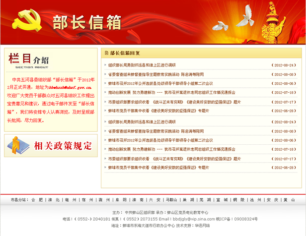 中共五河縣委組織部“部長信箱”于2012年2月正式開通,地址為bbwhzzb@ahxf.gov.cn。歡迎廣大黨員干部群眾對五河縣組織工作提出寶貴意見和建議,通過電子郵件發(fā)至“部長信箱”,我們將安排專人認(rèn)真瀏覽,及時呈報部長批閱,盡力回復(fù)。